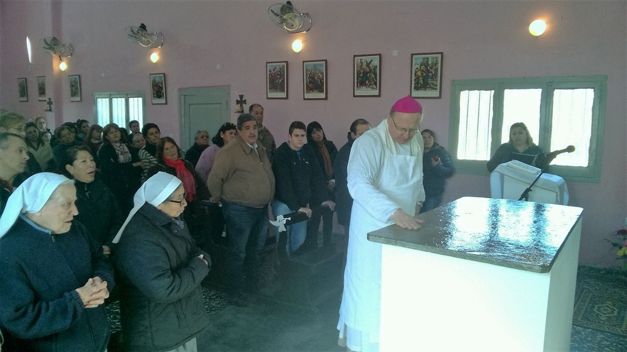 Seguidamente, se refirió al sentido de la ceremonia, indicando que "a este templo hoy lo vamos a dedicar, eso significa que va a estar dedicado sólo para el culto, no para otra cosa. Hay en las paredes cuatro cruces que nos van a recordar que el templo está consagrado, las voy a ungir, como también voy a ungir el altar con el Santo Crisma. De esta forma el altar representa a Jesucristo. Espero que cada año, celebren la Misa, el 23 de julio, recordando esta dedicación. Qué lindo sería que los niños de la catequesis, cuando vengan, encuentren a su catequista rezando frente a Jesús Eucaristía, que puedan ver cómo la catequista verdaderamente ama y está unida a Jesús, cómo tiene una gran fe. Ahí sí, los niños van a tener ganas de recibir a Jesús en la Eucaristía”. Y exhortó a los fieles a que "vengan permanentemente a este templo a rezar y lo cuiden”.