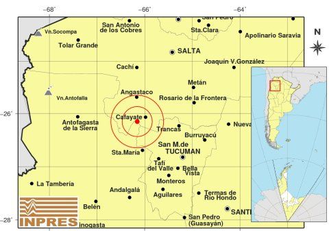 Epicentro: 121 km al NO de San Miguel De Tucumán, 165 km al SO de Salta, 20 km al SO de Cafayate. -26.150 (lat) -66.157 (long)