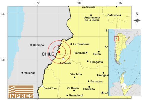 Epicentro: 135 km al NO de La Rioja, 166 km al O de San F. Del Valle De Catamarca, 30 km al SE de Tinogasta. -28.308 (lat) -67.425 (long)