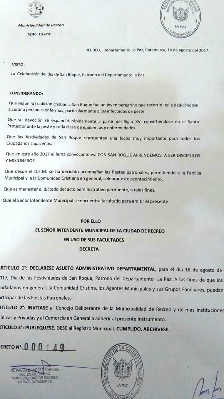 2 fotos 2 fotos miércoles, 16 de agosto de 2017 10:38 miércoles, 16 de agosto de 2017 10:38 La Secretaria de Gobierno de la Municipalidad de Recreo informa que se decretó Asueto Administrativo en toda la jurisdicción Municipal.
