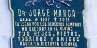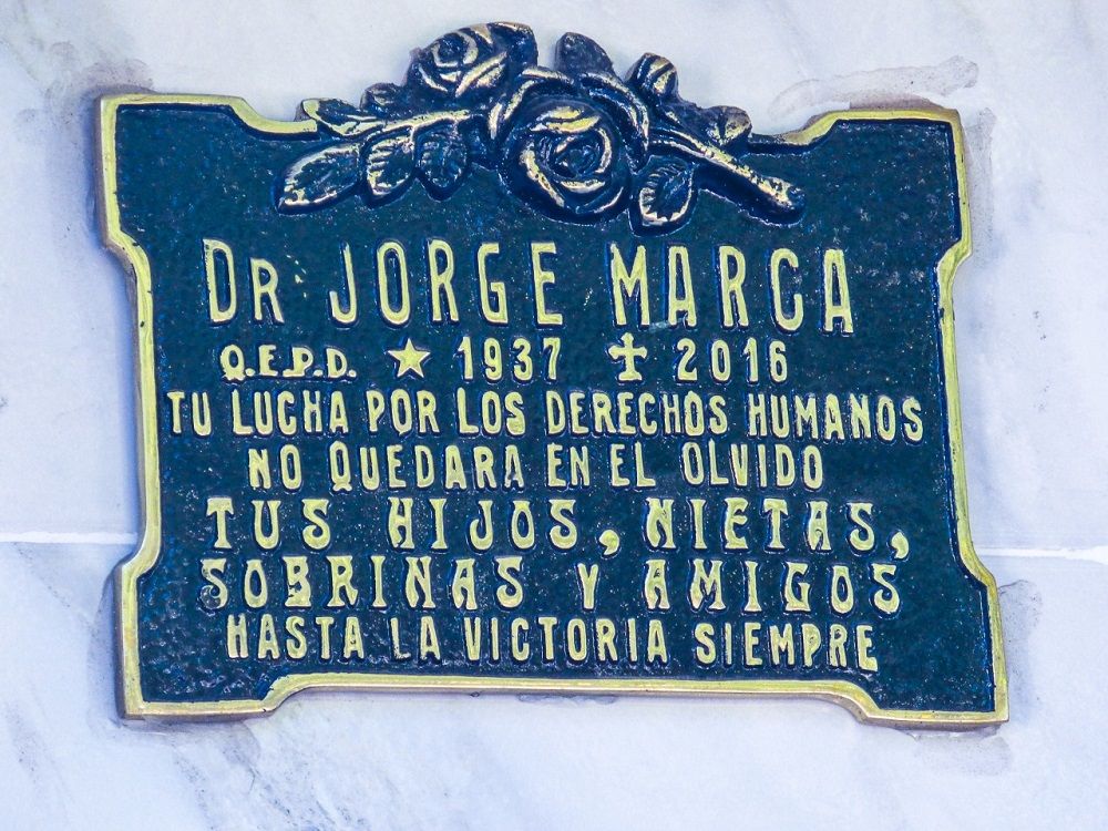 Inicialmente, en la cobertura del sepulcro fue descubierta una placa recordatoria, que reza: "Dr. Jorge Marca QEPD (1937-2016). Tu lucha por los derechos humanos no quedará en el olvido. Tus hijos, nietas, sobrinas y amigos. Hasta la victoria siempre”.