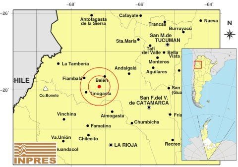 Epicentro: 154 km al NO de San F. Del Valle De Catamarca, 169 km al N de La Rioja, 33 km al SO de Belén. -27.915 (lat) -67.182 (long)