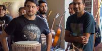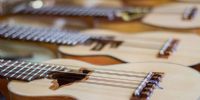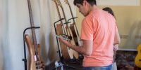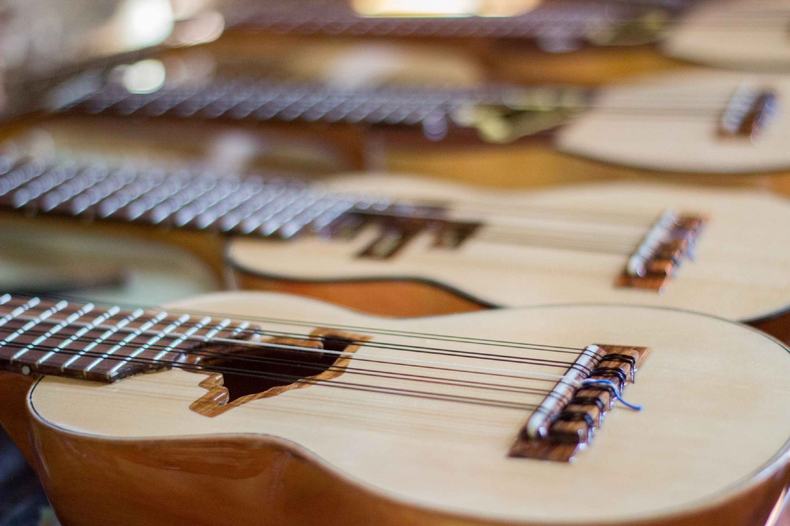 y probar guitarras, charangos, violines, cajas y otros instrumentos que