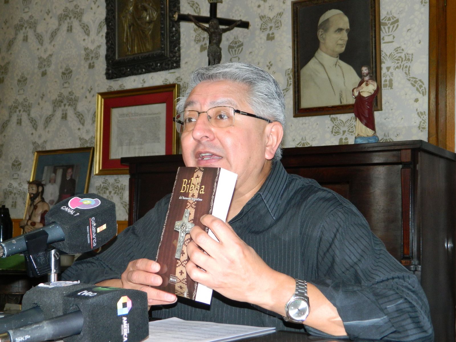 Biblia del NOA y las sorteó entre los periodistas y camarógrafos presentes.