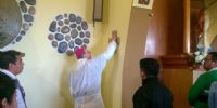bendijo agua y con ella la pila bautismal, también aspergió las paredes del