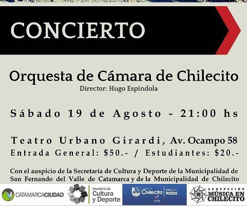 Con auspicio de la Municipalidad de SFVC y la Municipalidad de Chilecito, el sábado 19 de agosto en el Complejo Cultural Urbano Girardi, a las 21, se llevará a cabo el concierto de la Orquesta de Cámara de Chilecito.