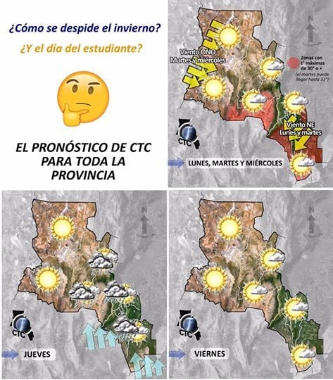 El frente frío llegará por la madrugada haciendo aumentar la nubosidad en las regiones Este, Centro y sur de la del Oeste. Este frente hará bajar las temperaturas, dándonos una tarde fresca en gran parte de la provincia (y fría en zonas altas), pudiendo tener una máxima de alrededor de 20° en las zonas bajas. Las probabilidades de precipitaciones aumentarán considerablemente, siendo posible que por la madrugada se den chaparrones, lluvias y lloviznas dispersas en las regiones Este y Centro especialmente. En la segunda mitad del día, se irá estabilizando. Cuando hablamos de la región Centro, no nos referimos solamente al Valle Central, sino también a las localidades donde suelen darse los mayores festejos del día del estudiante, como El Rodeo y La Puerta. De todos modos, por ahora solo se ven las probabilidades de lluvias en horas de la madrugada. Luego del mediodía se reducen estas chances.