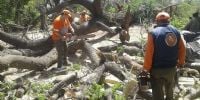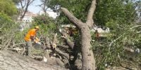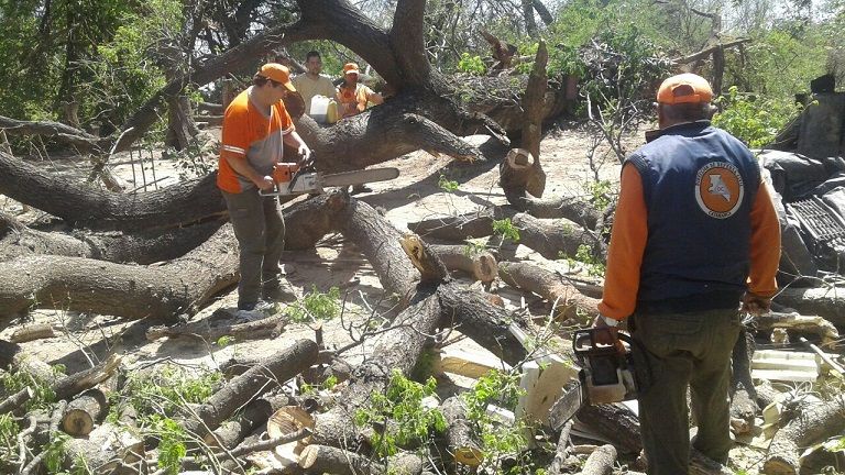 Al lugar arribó personal de la Dirección de Defensa Civil, que con máquinas especiales y motosierras, procedió a cortar y trozar el árbol para luego retirarlo del lugar.