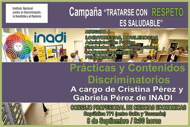 En esta oportunidad, estarán capacitadoras del INADI de sede central, María Gabriela Pérez y Cristina Pérez, integrantes del área de Políticas Educativas y Formación del INADI, especialistas en temáticas de discriminación y estará dirigida a agentes de la administración pública, a personas encargadas de atención pública tanto privada como estatal, a comunicadores a trabajadores de la salud.