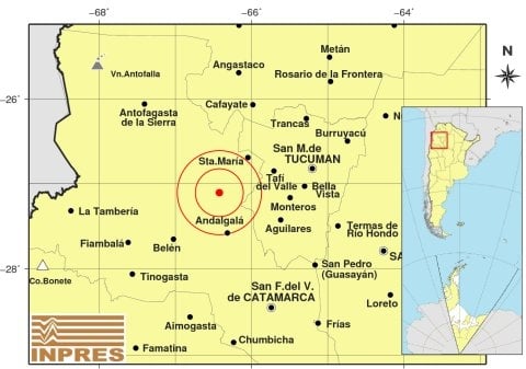 Epicentro: 125 km al O de San Miguel De Tucumán, 163 km al NO de San F. Del Valle De Catamarca, 54 km al N de Andalgalá. -27.107 (lat) -66.422 (long)