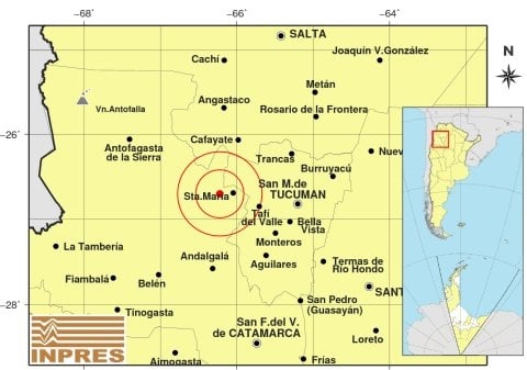 Epicentro: 103 km al O de San Miguel De Tucumán, 199 km al N de San F. Del Valle De Catamarca, 18 km al O de Sta.María. -26.704 (lat) -66.223 (long)