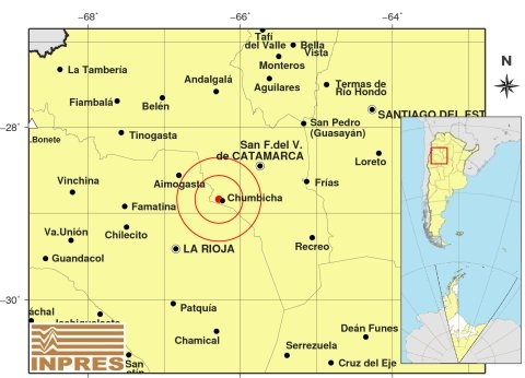 Epicentro: 68 km al SO de San F. Del Valle De Catamarca, 84 km al NE de La Rioja, 5 km al O de Chumbicha. -28.839 (lat) -66.280 (long)