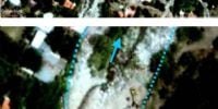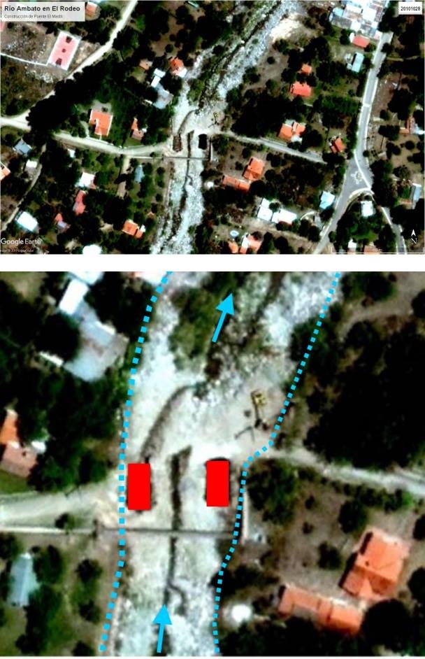 Nota: La foto fue extraída del Google Earth y corresponde al año 2010. La de arriba es la original y la de abajo muestra en color rojo donde se construyeron los estribos del puente y en celeste lo que sería el cauce ordinario del rio. Resulta evidente, que los estribos están invadiendo y obstruyendo en gran parte la sección hidráulica “natural” del río en ese sector, la cual corresponde a los flujos formativos del cauce ordinario.