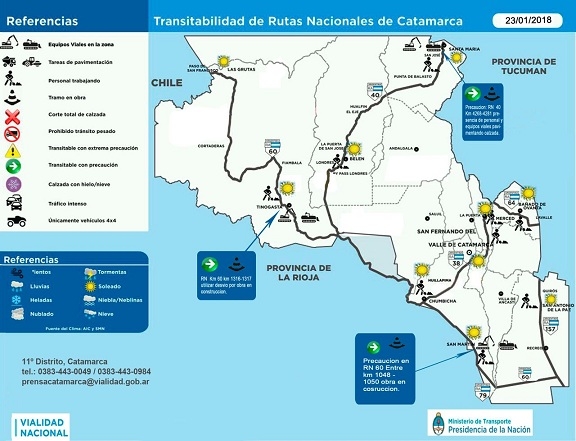 Transitable en toda su extensión. Entre Las Mojarras (Santa María) y Quilmes (Tucumán), disminuir la velocidad en travesías urbanas y respetar las señales preventivas de obra, por presencia de personal y equipos viales en trabajos de pavimentación. Precaución en paso de zona de Badenes.