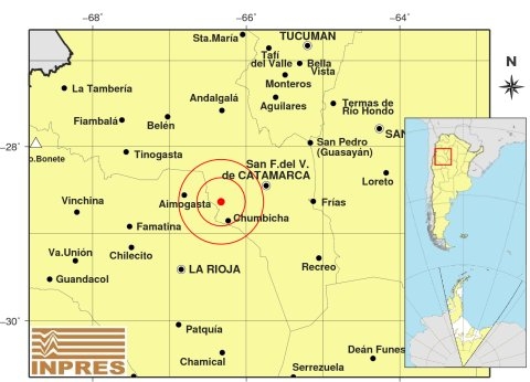 Epicentro: 61 km al O de San F. Del Valle De Catamarca, 99 km al NE de La Rioja, 25 km al N de Chumbicha. -28.637 (lat) -66.328 (long)