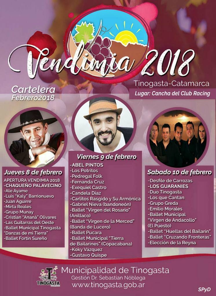 La Vendimia presentará una cartelera artística con una gran participación de grupos de danzas, solistas y conjuntos folclóricos locales; pero también ofrecerá al público figuras de renombre nacional como hace muchos años no se apreciaba: