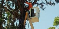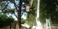 Mediante la utilización de una máquina cargadora y una grúa de elevación de la comuna, entre otras herramientas, los trabajadores de ambos organismos retiraron pinos de gran porte que amenazaban con precipitarse hacia calles públicas.