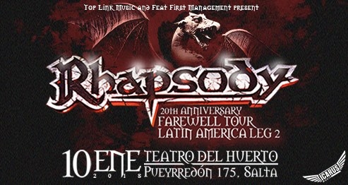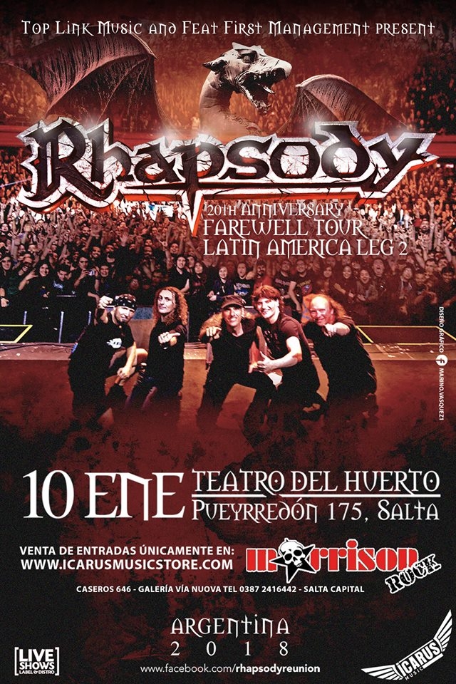 La banda italiana es considerada uno de los íconos más grandes del SymphonycPower Metal y promete realizar un evento magnánimo para celebrar los 20 años de su primer lanzamiento oficial, tocando el álbum “Symphony Of EnchantedLands”, de manera íntegra, junto a grandes clásicos de todos los tiempos. Su gira se consagra bajo el nombre “Rhapsody 20th AnniversaryFarewell Tour - LatinAmericaLeg2”.