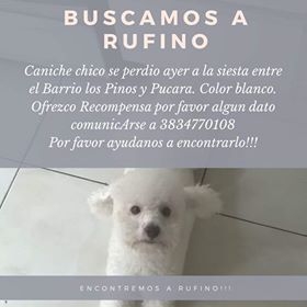 "Lo perdi el 3 de enero por Barrio Pucara atras del jardin del Pia, por av. Illia camino al Jumeal. Es caniche blanco con corte de peluqueria con colita cortita macho. Se llama Rufino y doy recompensa de $5000 . Gracias a Dios mucha gente me esta compartiendo la publicacion por face pero seria de gran ayuda si me dan una mano.