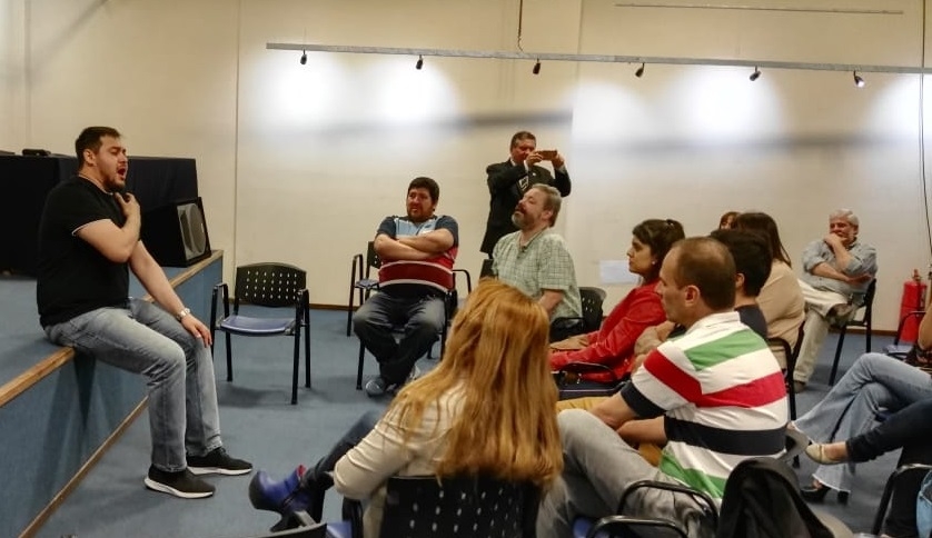 El taller, acompañado por el pianista Prof. Abilio Bize, y destinado a cantantes líricos y populares, desmenuzó de manera divertida temas acerca de la producción del espectáculo, presencia escénica del cantante e incorporación de elementos que utilizan los cantantes líricos a los cantantes populares y viceversa.