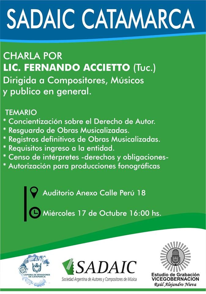 Ya por la tarde, a partir de las 16 horas en el Salón Auditorio del Senado ubicado en el anexo de calle Perú N° 18, el licenciado Fernando Accietto de la provincia de Tucumán, dictará una charla a compositores, músicos, intérpretes y público en general en la que se tratará sobre: Concientización sobre Derecho de Autor, Resguardo de Obras Musicalizadas, Registros Definitivos de Obras Musicalizadas, requisitos de ingreso a la Entidad, Censo de Intérpretes -derechos y obligaciones-, y autorización para producciones fonográficas.