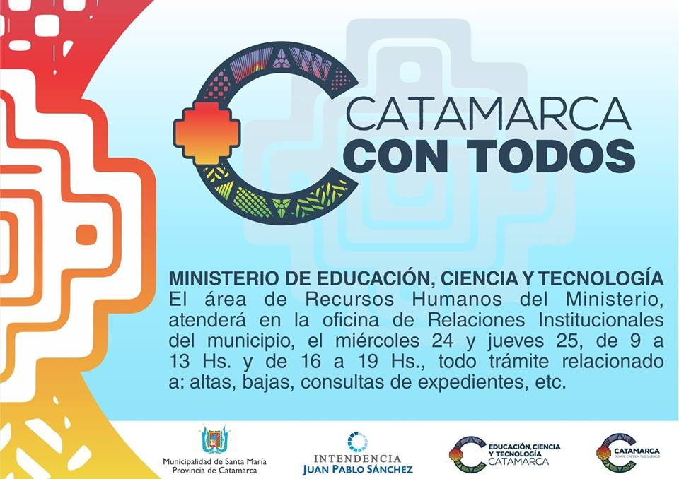 En el municipio, el Ministerio de Educación, Ciencia y Tecnología, a través del área de Recursos Humanos del Ministerio, atenderá en la oficina de Relaciones Institucionales, miércoles 24 y jueves 25, de 9 a 13 y de 16 a 19, todo trámite relacionado a altas, bajas, consultas de expedientes, etc.