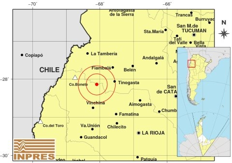 Epicentro: 187 Km. al NO de La Rioja; 234 Km. al O de San F. Del Valle De Catamarca; 53 Km. al O de Tinogasta -28.139 (lat) -68.095 (long)