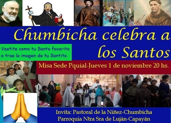 También en la parroquia Nuestra Señora de Luján, con sede en Chumbicha, departamento Capayán, se llevará a cabo la celebración de todos los Santos. Será el jueves 1 de noviembre, en la Misa de las 20.00, bajo la consigna “Vestite como tu Santo favorito o trae su imagen”.