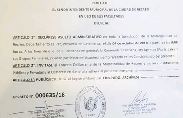miércoles, 3 de octubre de 2018 20:04 miércoles, 3 de octubre de 2018 20:04 La medida se debe a la llegada de las "Reliquias de Fray Mamerto Esquiú" a nuestra Jurisdicción Municipal de Recreo.