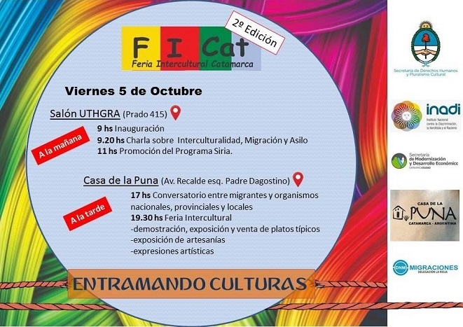 La delegación en Catamarca del INADI, la secretaría de Derechos Humanos y Pluralismo Cultural de la Nación y la Secretaria de Modernización de la Capital, invitan a la “2º Feria Intercultural Catamarca (FICAT): Entramando Culturas”, que se realizará este viernes 5 de octubre en un intensa jornada que incluirá un ciclo de charlas y la puesta en marcha de la feria intercultural, en la Casa de la Puna, ubicada en Av. Recalde esq. Padre Dagostino.