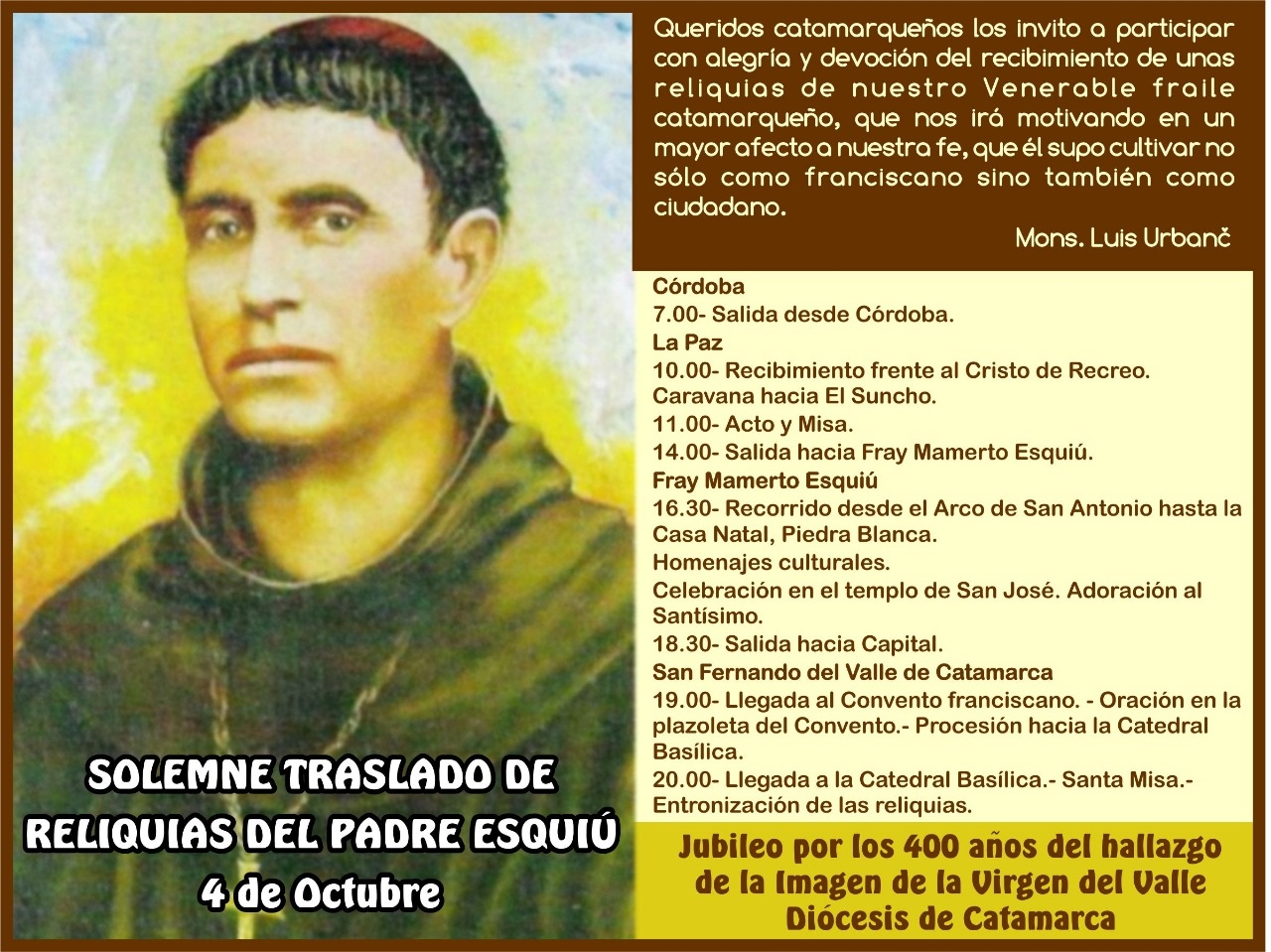 A las 14 hs., está prevista la partida hacia el departamento Fray Mamerto Esquiú, donde se ha organizado un acompañamiento desde el acceso a San Antonio hasta la Casa Natal de Esquiú, en Piedra Blanca, donde a las 16.30 hs. habrá otra celebración religiosa en el templo de San José, destinado a la Adoración del Santísimo.