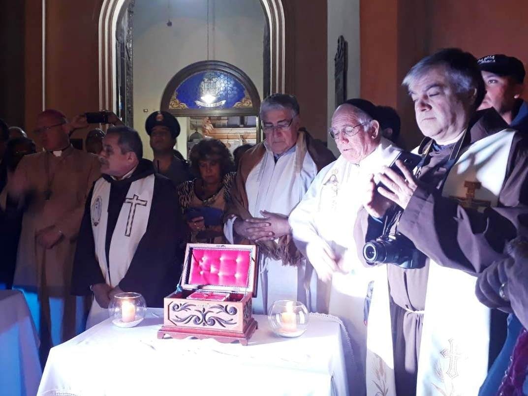 Antes de llegar a la plaza principal, las reliquias fueron llevadas en andas, precedida por la imagen de San Francisco de Asís, hasta el templo parroquial de San José, donde se realizó una celebración de acción de gracias con Adoración Eucarística, presidida por el Vicario General de la Diócesis, Pbro. Julio Quiroga del Pino. La misma contó con la presencia de autoridades civiles y de las fuerzas de seguridad, banderas de ceremonia de la Policía de la Provincia y de las agrupaciones gauchas y de los establecimientos educativos del departamento, junto con sus directivos, docentes y alumnos, quienes desbordaron el antiguo templo.