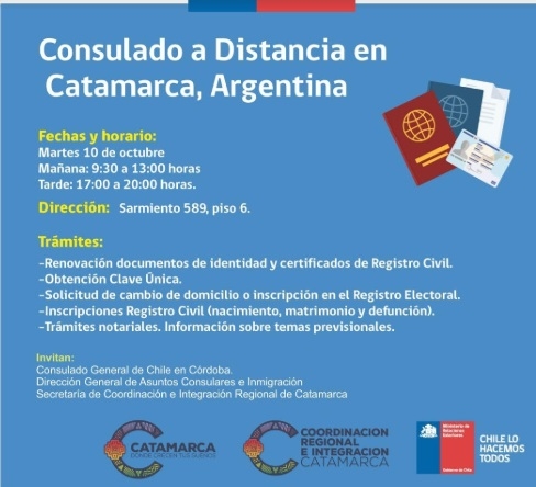 En el marco de la visita del cónsul General de Chile, ministro consejero Frank Peter Sinclair Manley, que tiene previsto interactuar con residentes chilenos en Catamarca, se realizarán trámites referidos a Registro Civil de las Personas como si estuvieran en su país.