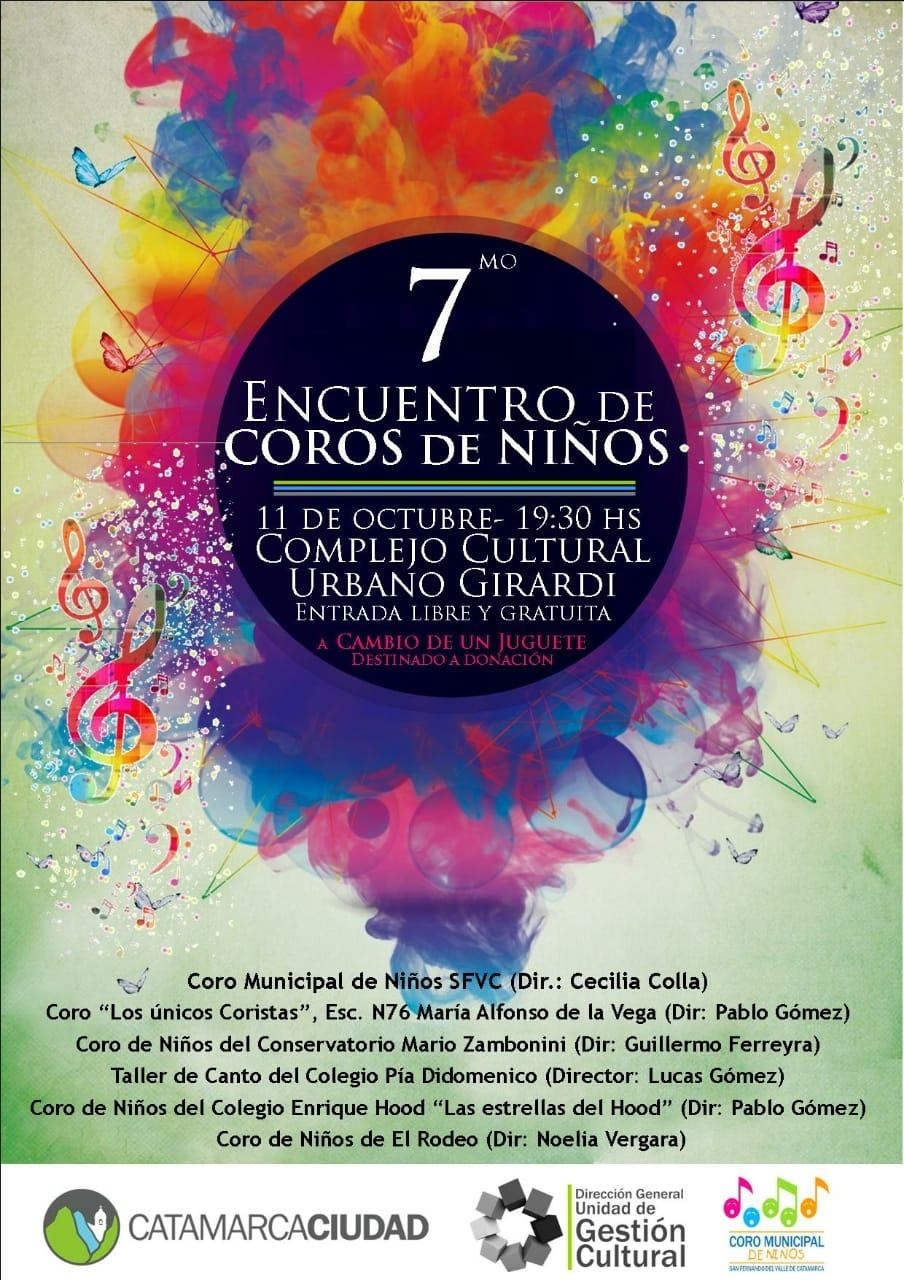 De este 7mo encuentro participaran el Coro de Niños de la Municipalidad de SFVC, Coro “Los Únicos Coristas” de la escuela 76 María Alfonso de la Vega, Coro de Niños del Conservatorio Mario Zambonini, Taller de canto del colegio Pía Didomenico, Coro de Niños del colegio Enrique Hood “Las Estrellas del Hood” y la invitación especial del Coro de Niños de El Rodeo.