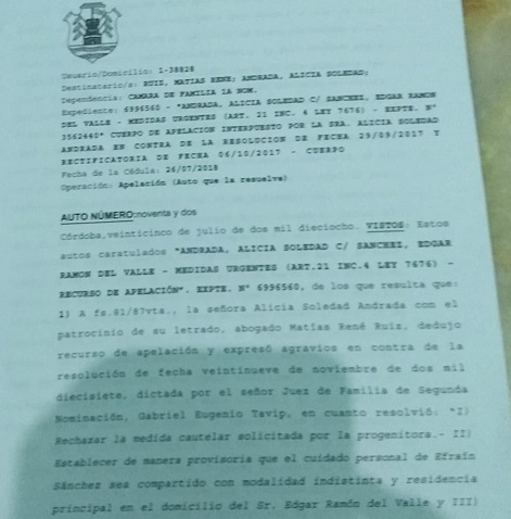 Es por eso que Alicia Soledad Andrada, pidió la intervención de la Justicia de Recreo, solicitando su intervención, en una causa que "ordena" la Cámara de Familia, 1° Nominación de la Justicia de Córdoba.
