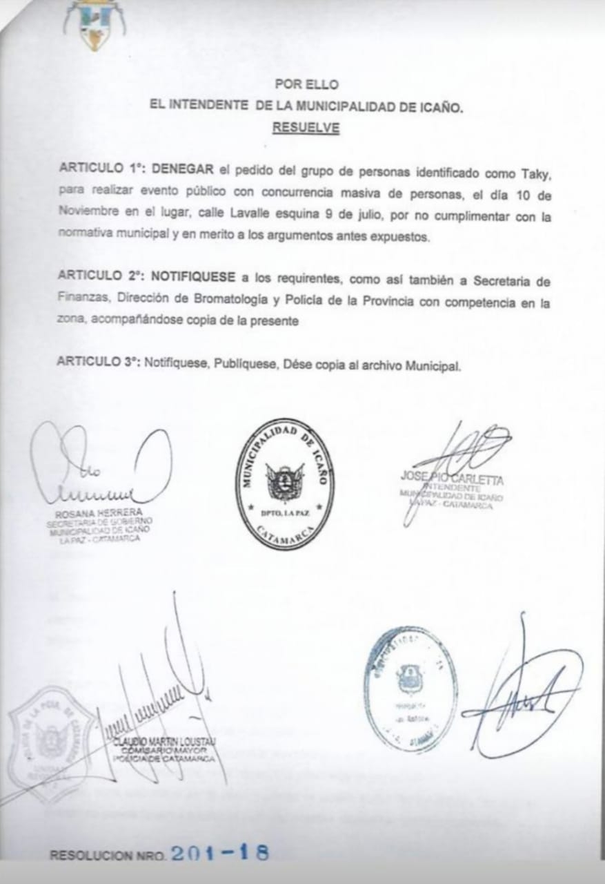 El pedido de autorización del evento por parte de Agrupación Cultural Taki, tiene fecha 30 de octubre y fue ingresada por la Delegación Municipal de San Antonio de La Paz. Mientras que la Resolución firmada por el Intendente Carletta tiene fecha 08 de noviembre de 2018 y los organizadores fueron notificados ayer.