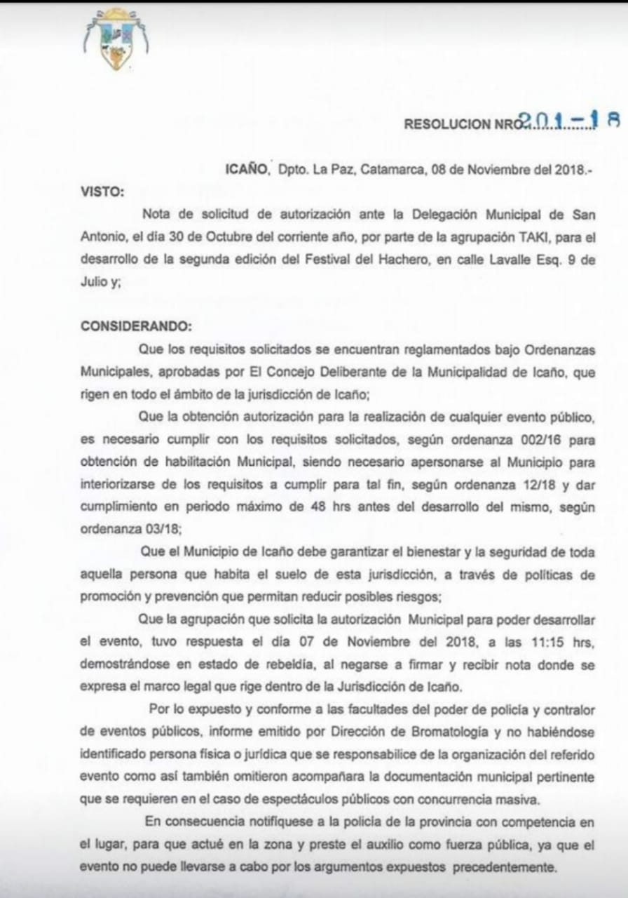 A través de esta resolución, queda denegado el permiso para llevar a cabo esta noche, la 2° Edición del Festival del Hachero en San Antonio de La Paz, organizado por la Agrupación Cultural Taki, por "no cumplimentar con la normativa municipal" vigente.