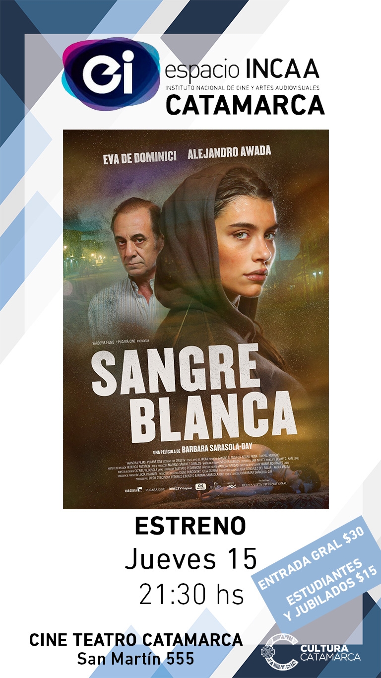 En su día de estreno, Espacio INCAA Catamarca pondrá en cartelera este jueves 15 de noviembre a las 21.30, el filme “Sangre blanca”, un thriller apto para mayores de 16 años, protagonizado por Alejandro Awada y Eva de Dominici, dirigidos por Bárbara Sarasola-Day.