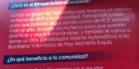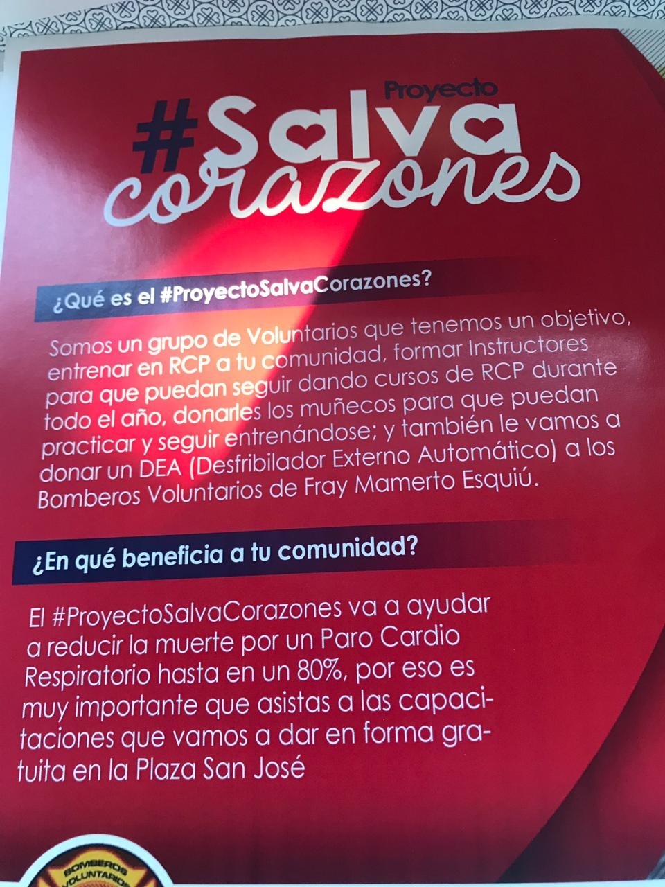El proyecto “Salva Corazones” propone la formación de los aspirantes a bomberos de Fray Mamerto Esquiú y capacitación de instructores de RCP para la comunidad. Se realizarán jornadas abiertas a la comunidad con el fin de ayudar a prevenir la muerte por paro cardíaco respiratorio hasta un 80%.