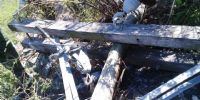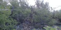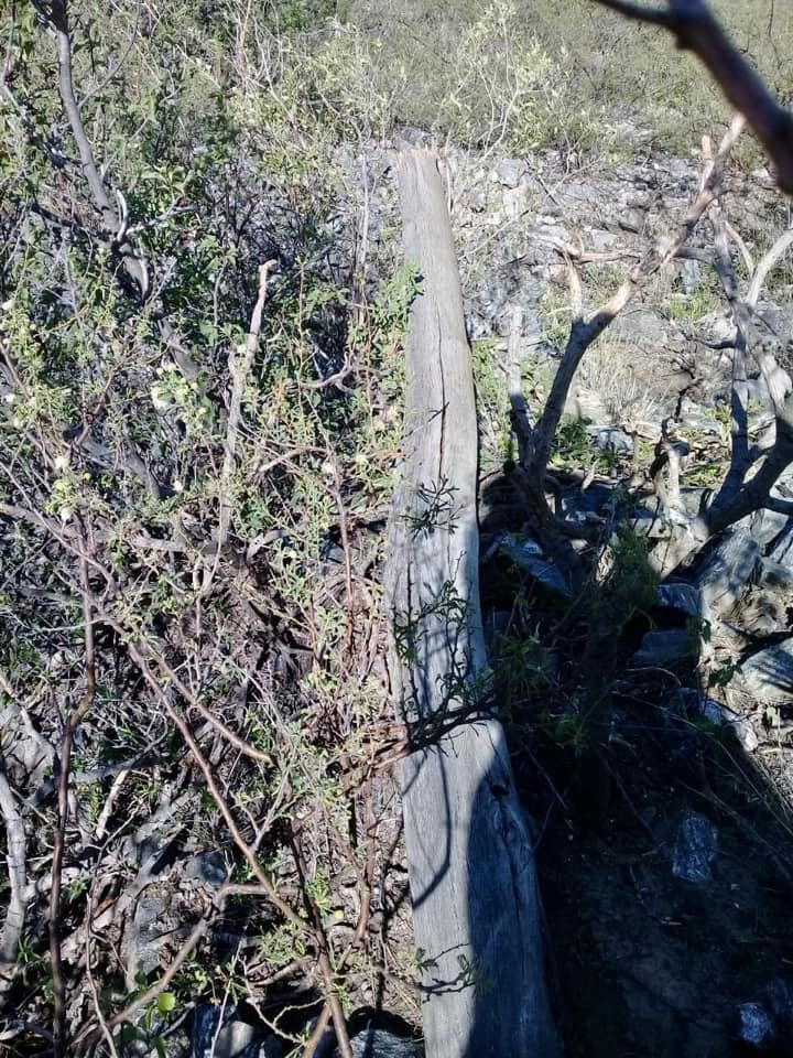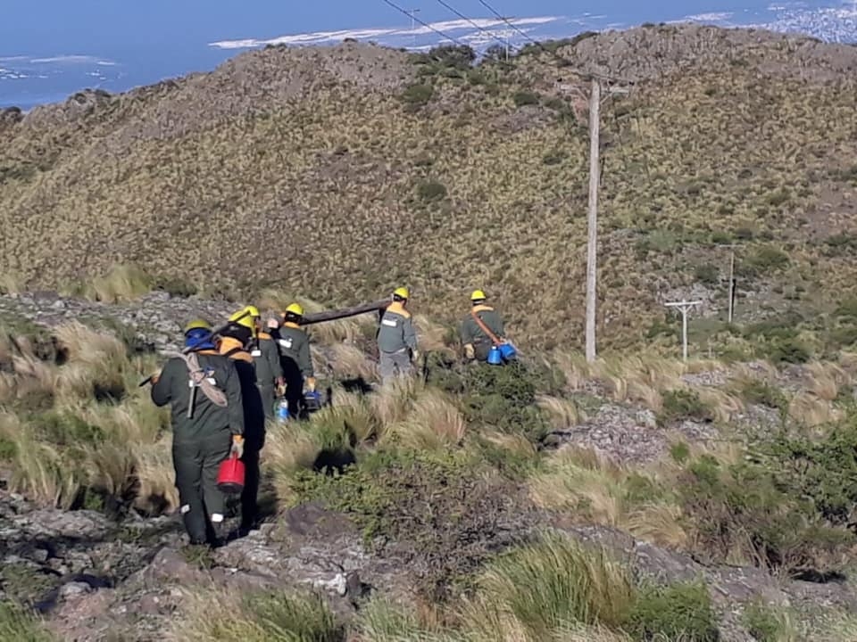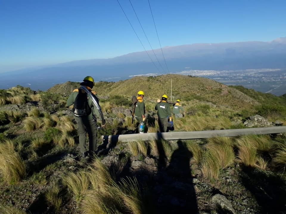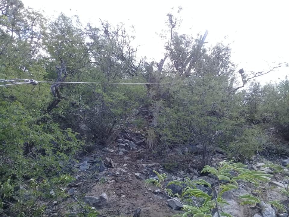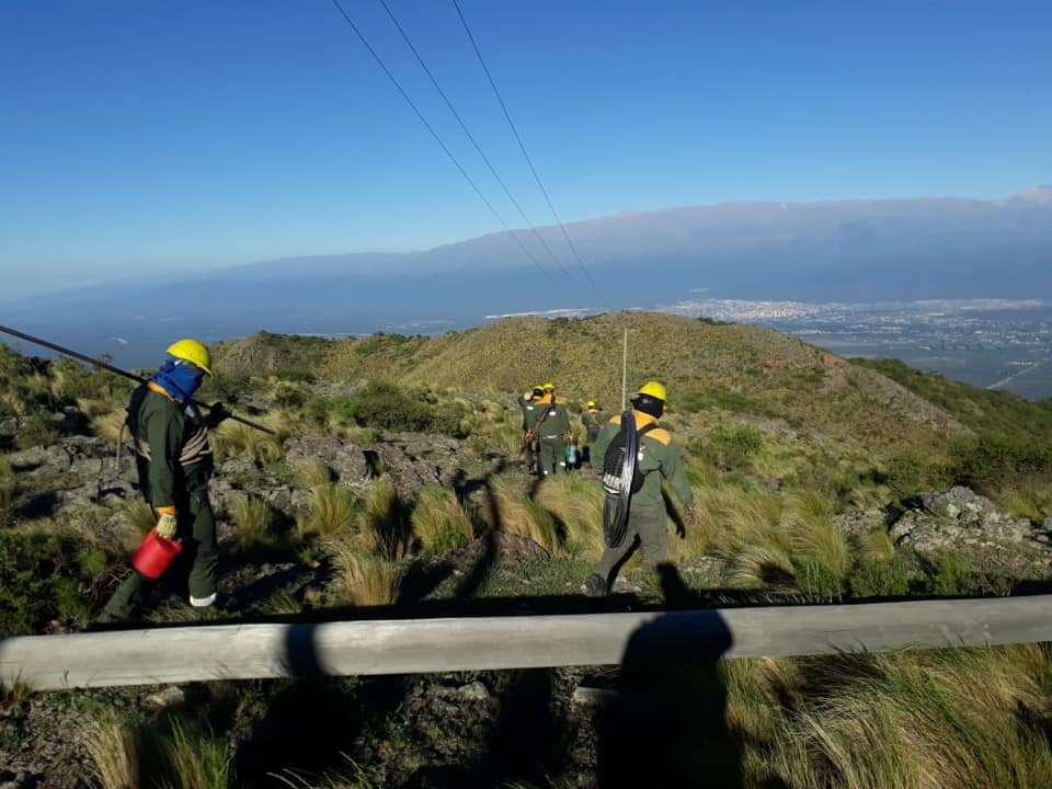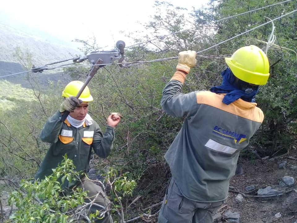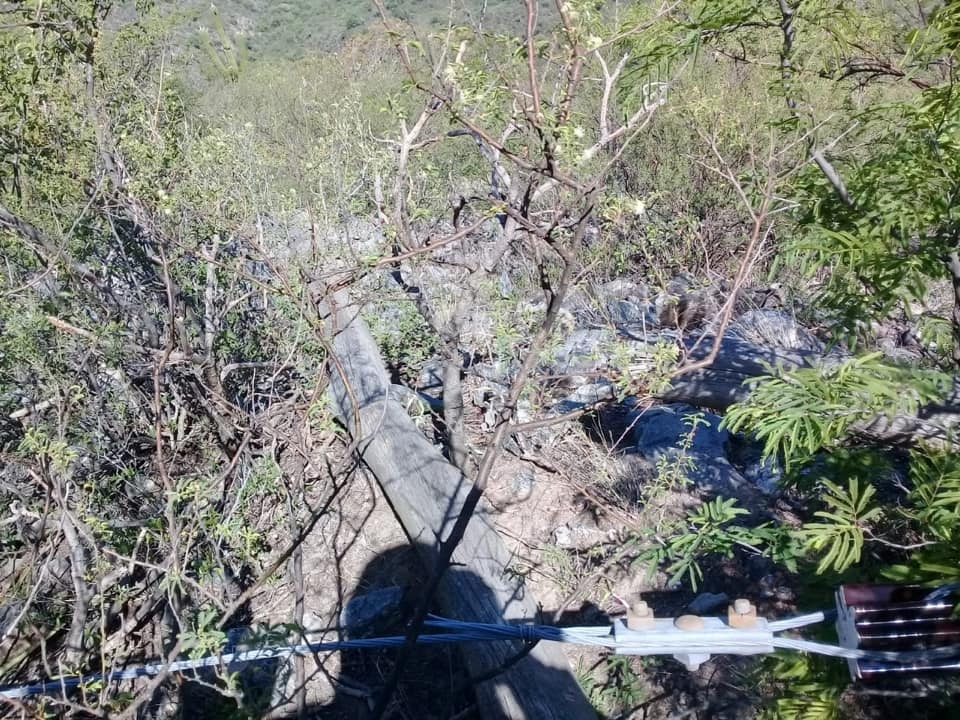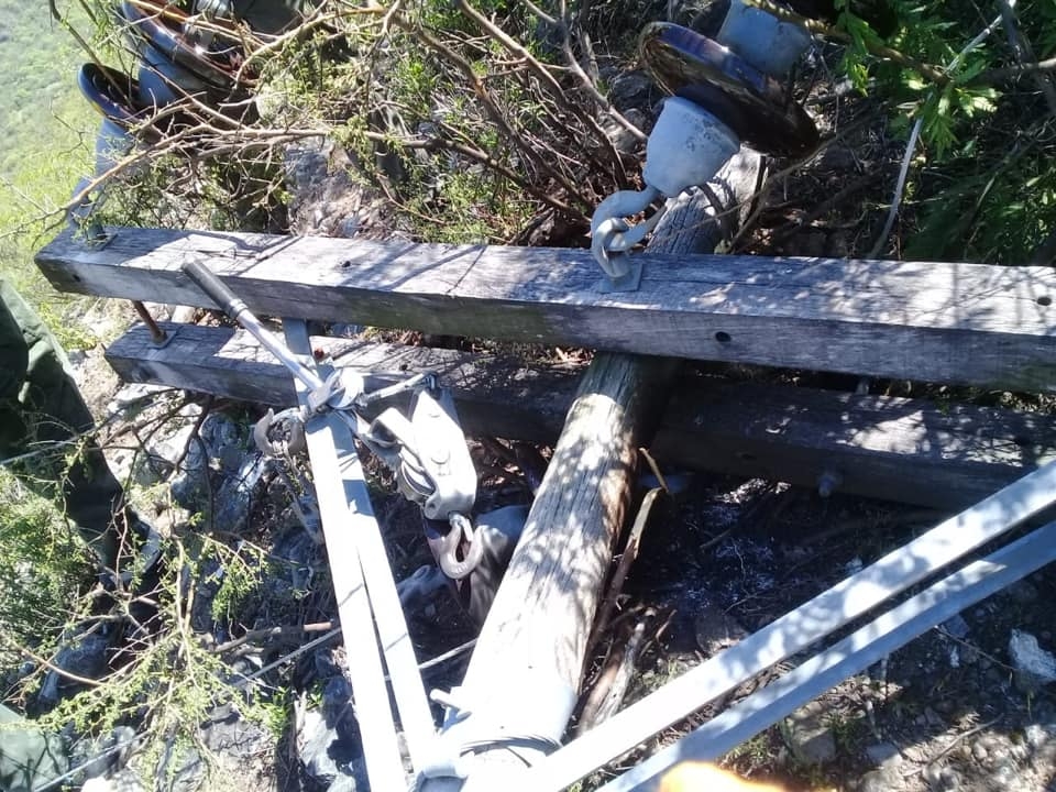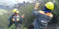 Se quebró un poste y la línea quedó en el suelo, en un lugar donde es imposible acceder con vehículos y los materiales de reemplazo hay que transportarlos a hombro.