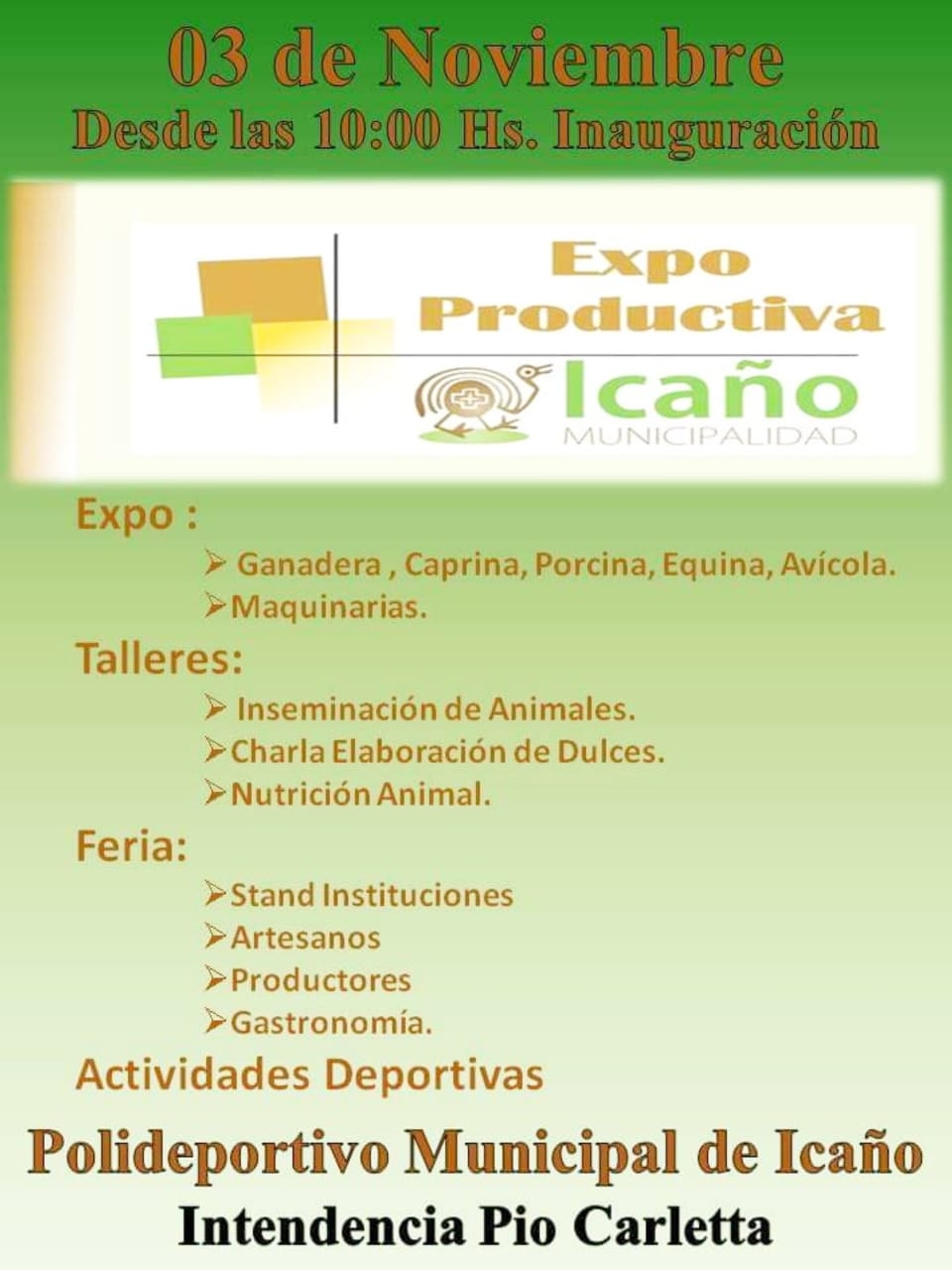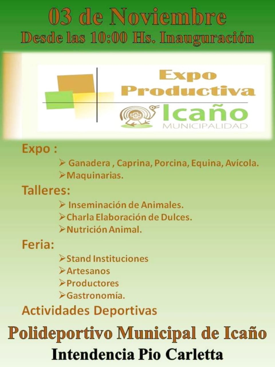 Mañana sábado a las 10 horas, está previsto el acto de apertura de la Expo Productiva Icaño 2018, en el departamento La Paz.