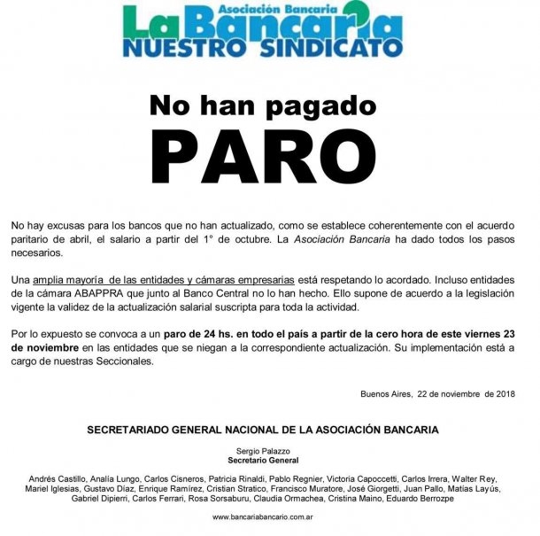 En ese marco, la Bancaria informó que "se convoca a un paro de 24 horas en todo el país a partir de las cero horas de este viernes 23 de noviembre en las entidades que se niegan a la actualización".