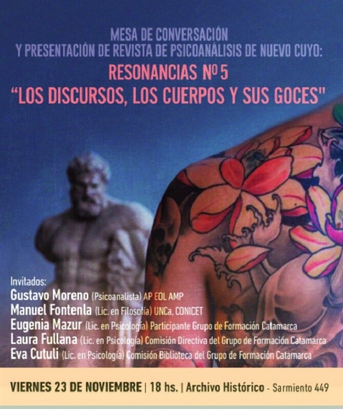 La actividad denominada Mesa de Conversación y presentación de revista de Psicoanálisis: Resonancias N° 5 “Los Discursos, Los Cuerpos y sus Goces” es organizada de manera conjunta entre la Dirección de Bibliotecas y Archivo, dependiente de la Secretaría de Estado de Cultura, y el Grupo en Formación Catamarca.