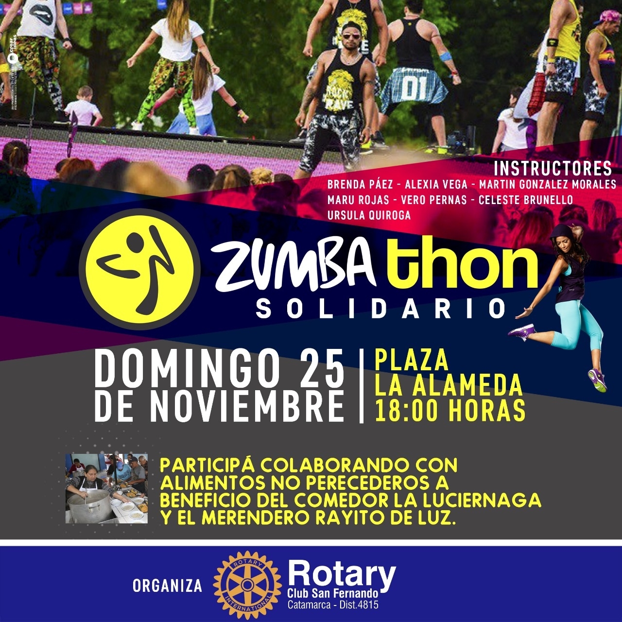"Todos los años realizamos distintas actividades solidarias con la finalidad de colaborar con distintas organizaciones, en esta oportunidad organizamos una “Zumbathon Solidaria” con más de 10 profesores que colaboran con nosotros y solo pedimos a los participantes colaborar con un alimento no perecedero para el Comedor "La Luciérnaga" y el Merendero "Rayito de Luz", el lugar será en la Plaza La Alameda a las 18 horas, los esperamos a todos los vecinos", destacó Ariel Molina, presidente del Rotary Club San Fernando.