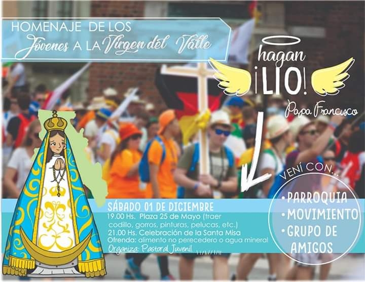 La Pastoral de Juventud invita a los integrantes de movimientos, grupos parroquiales y demás jóvenes catamarqueños a participar del Homenaje a la Virgen del Valle, que se llevará a cabo el sábado 1 de diciembre a partir de las 19 en el Paseo de la Fe.