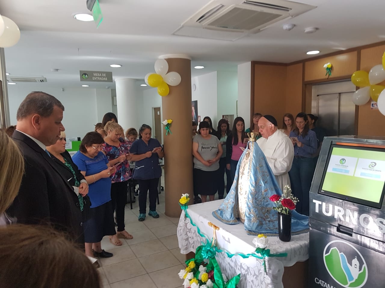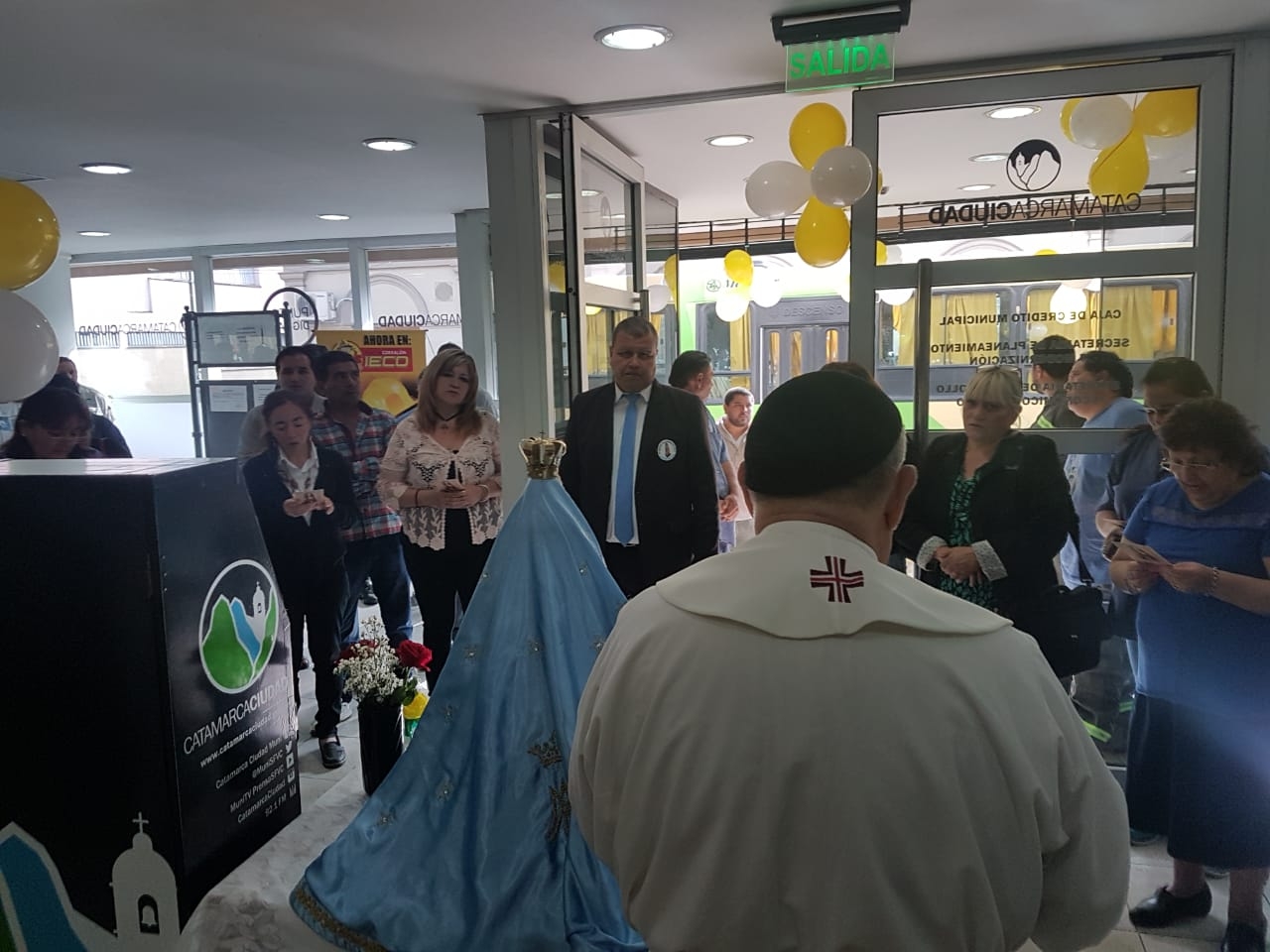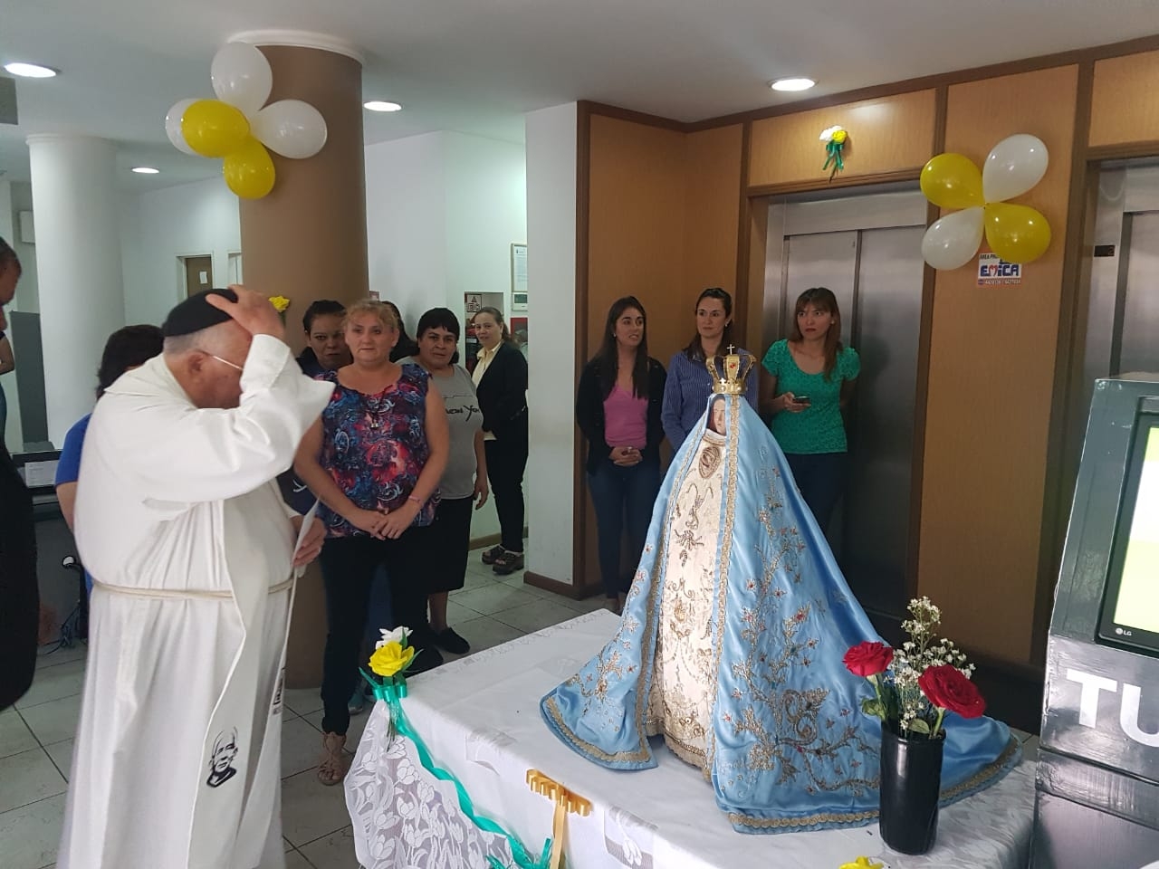 La Sagrada Imagen también llegó hasta la Caja de Crédito de la Municipalidad de la Capital, en brazos del P. Ángel Nieva, quien compartió un momento de oración y bendijo a quienes allí se desempeñan.