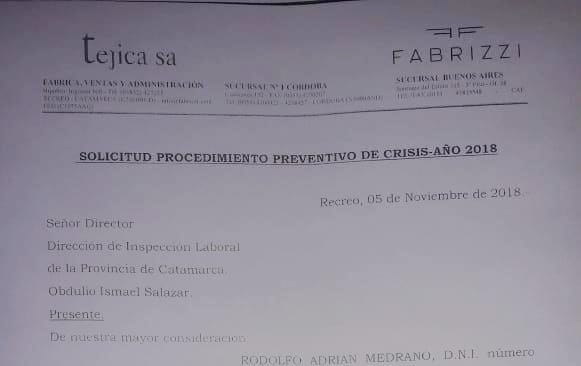 Tejica junto a otras cuatro Empresas solicitaron “procedimiento de crisis”. En ese momento se trató de las firmas Tevinor SA, Barbero SA, Tejica SA y Finpak SA.