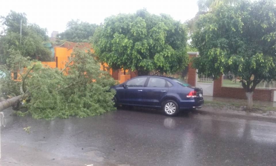 En la mañana de este martes, a causa de la torrencial lluvia y el fuerte viento, un árbol de gran porte fue derribado en la zona de La Ermita quedando atravesado en la calzada.