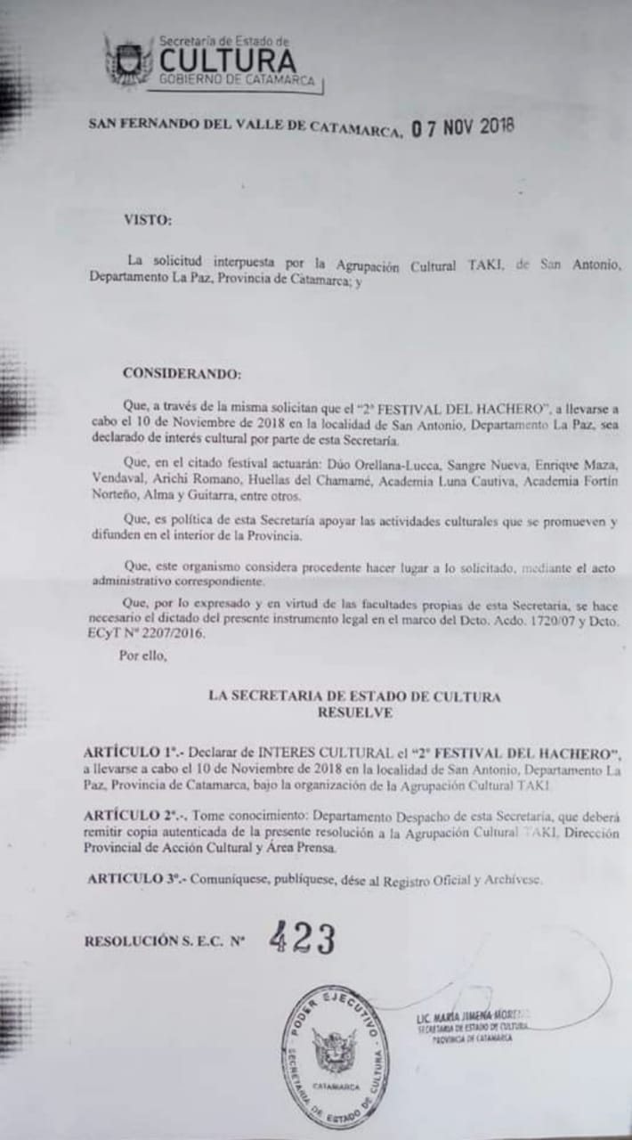 Y en el día de ayer la Agrupación Taki, recibió la Resolución 423/18, de la Secretaria de Estado de Cultura de la Provincia, donde se "Declara al Festival del Hachero de Interés Cultural".