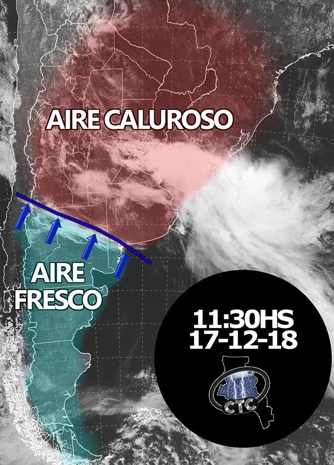Cuando ese sistema frontal que ven marcado en el mapa se acerque a la provincia comenzarán a generarse tormentas en distintos puntos del territorio provincial. Eso sucederá entre la tarde y la noche de hoy.